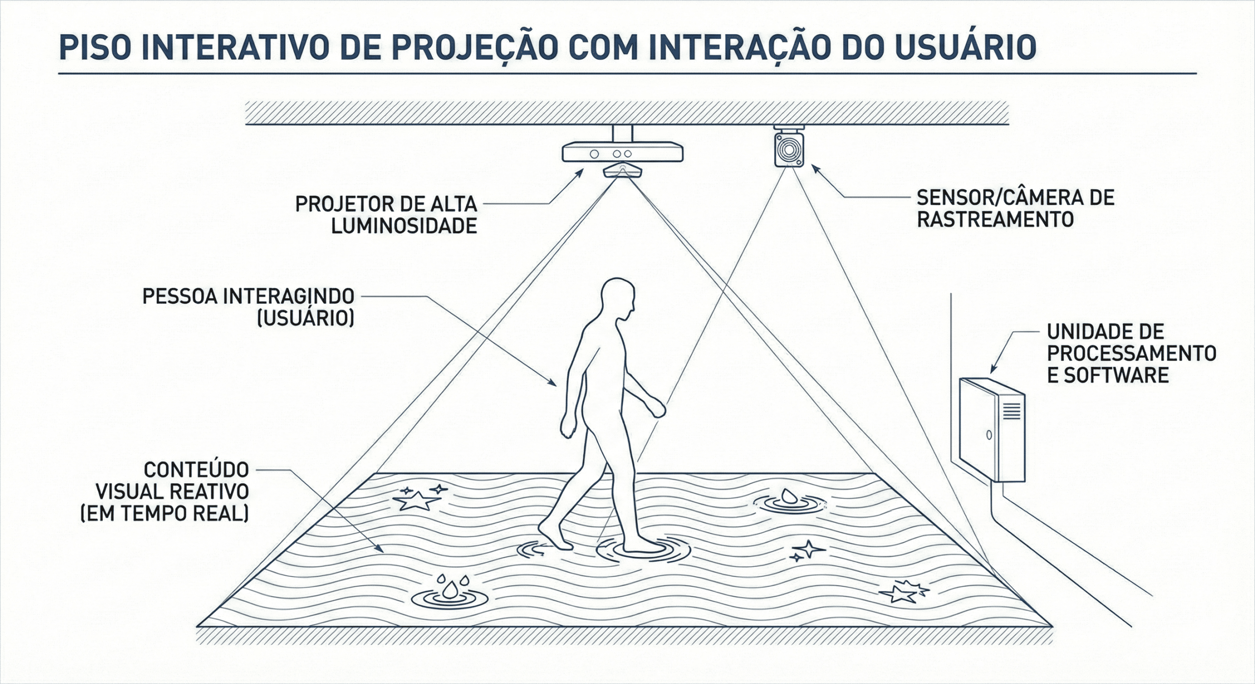 Na Illusion Studio, o Piso Interativo é desenvolvido com sensores de movimento, câmeras, softwares proprietários e motores gráficos 3D, garantindo precisão, fluidez e alto impacto visual.